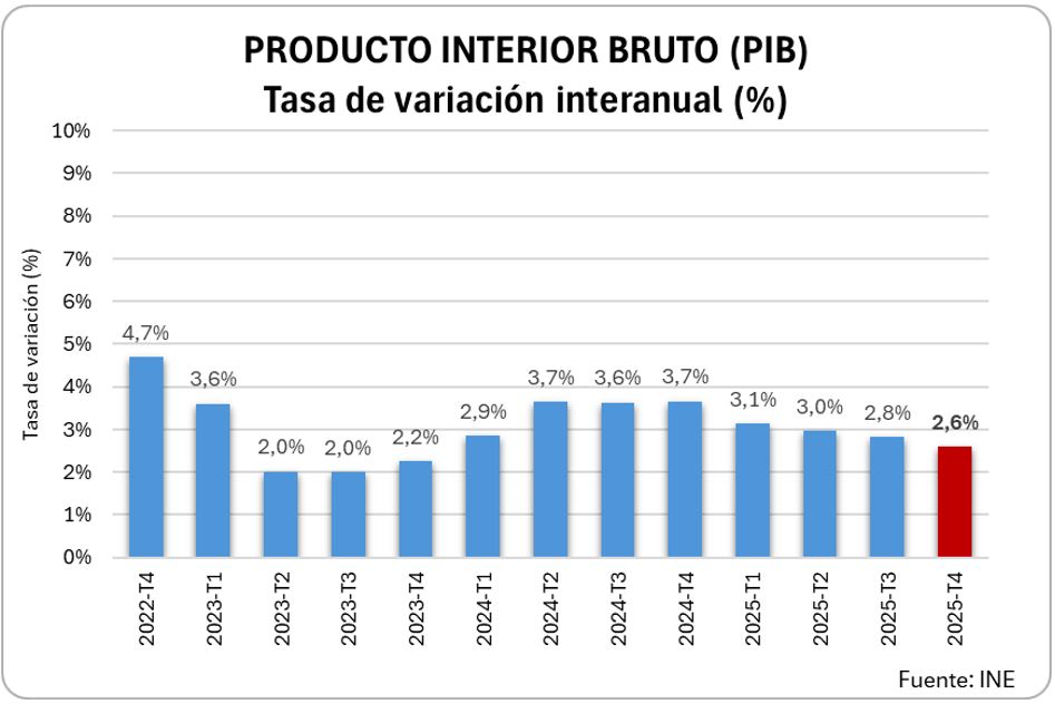 En tasas trimestrales, en el cuarto trimestre de 2025 el avance del PIB fue del 0,8%, dos décimas por encima de la tasa del tercer trimestre y se situó en el 2,6% interanual, tasa una décima inferior a la registrada en el trimestre precedente.