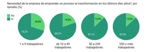 El estudio también desvela que la intensidad de la transformación varía según el tamaño y sector. Así, es mayor en empresas grandes, el 59% de las compañías de más de 249 trabajadores afirma que la transformación ha sido absolutamente necesaria, frente al 38,5% de las microempresas. Por sectores, la industria lidera la necesidad de cambios profundos (49,8%), mientras que la construcción es el sector donde menos empresas han precisado transformaciones globales (36,1%).