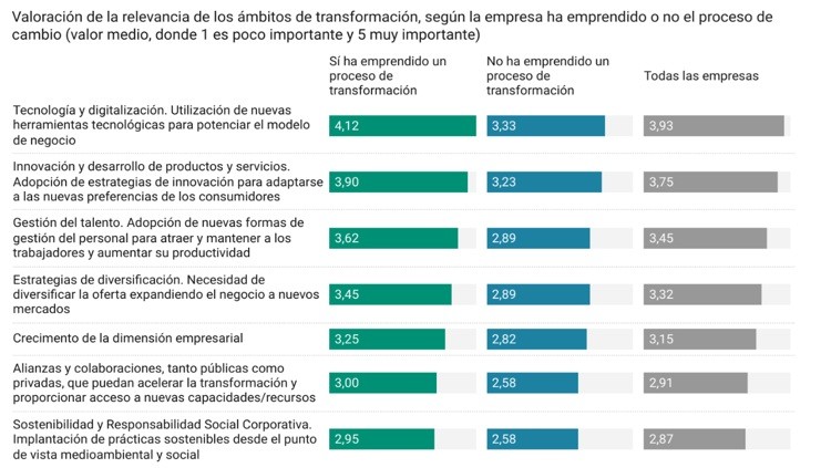 El estudio, basado en una encuesta a 1.765 empresas españolas de todos los sectores y tamaños, identifica la digitalización y la adopción de nuevas tecnologías como el factor más relevante para potenciar el modelo de negocio. Las empresas que han acometido transformaciones valoran como ámbitos clave, por encima de todo, la utilización de nuevas herramientas tecnológicas (4,12 sobre 5), la innovación para adaptarse a nuevas preferencias de los consumidores (3,90) y la gestión del talento (3,62).