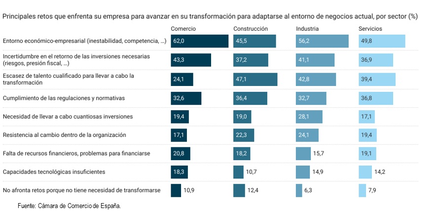 El principal reto para la transformación es el entorno económico-empresarial (54,5%), seguido de la incertidumbre sobre el retorno de la inversión (39,8%), la escasez de talento cualificado (37,1%) y el cumplimiento de regulaciones (34,5%).