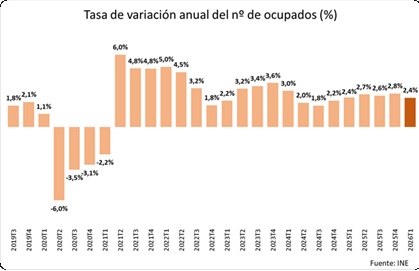 - La creación de empleo se enfría, pero la evolución interanual sigue siendo favorable, con 527.600 ocupados más y 80.600 parados menos, apoyada en el avance del empleo asalariado