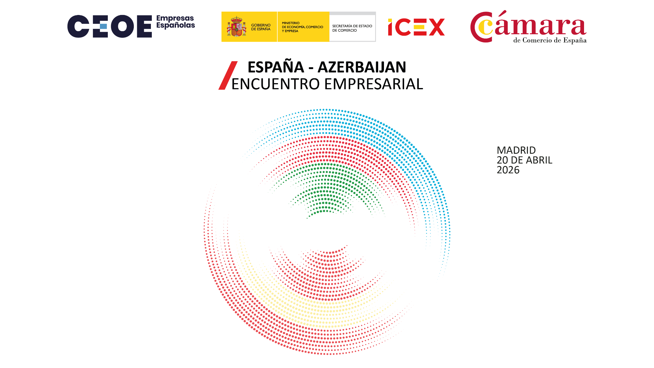 Con ocasión de la próxima visita de una importante delegación procedente de Azerbaiyán encabezada por el Viceministro del Ministerio de Economía, el Sr. Elnur Aliyev la Cámara de Comercio de España, la Secretaría de Estado de Comercio, a través de ICEX España Exportación e Inversiones, y la Confederación Española de Organizaciones Empresariales (CEOE) organizan un Encuentro Empresarial España – Azerbaiyán el próximo 20 de abril a las 9.30h en la Cámara de Comercio de España (Ribera del Loira 12, 28042 Madrid)