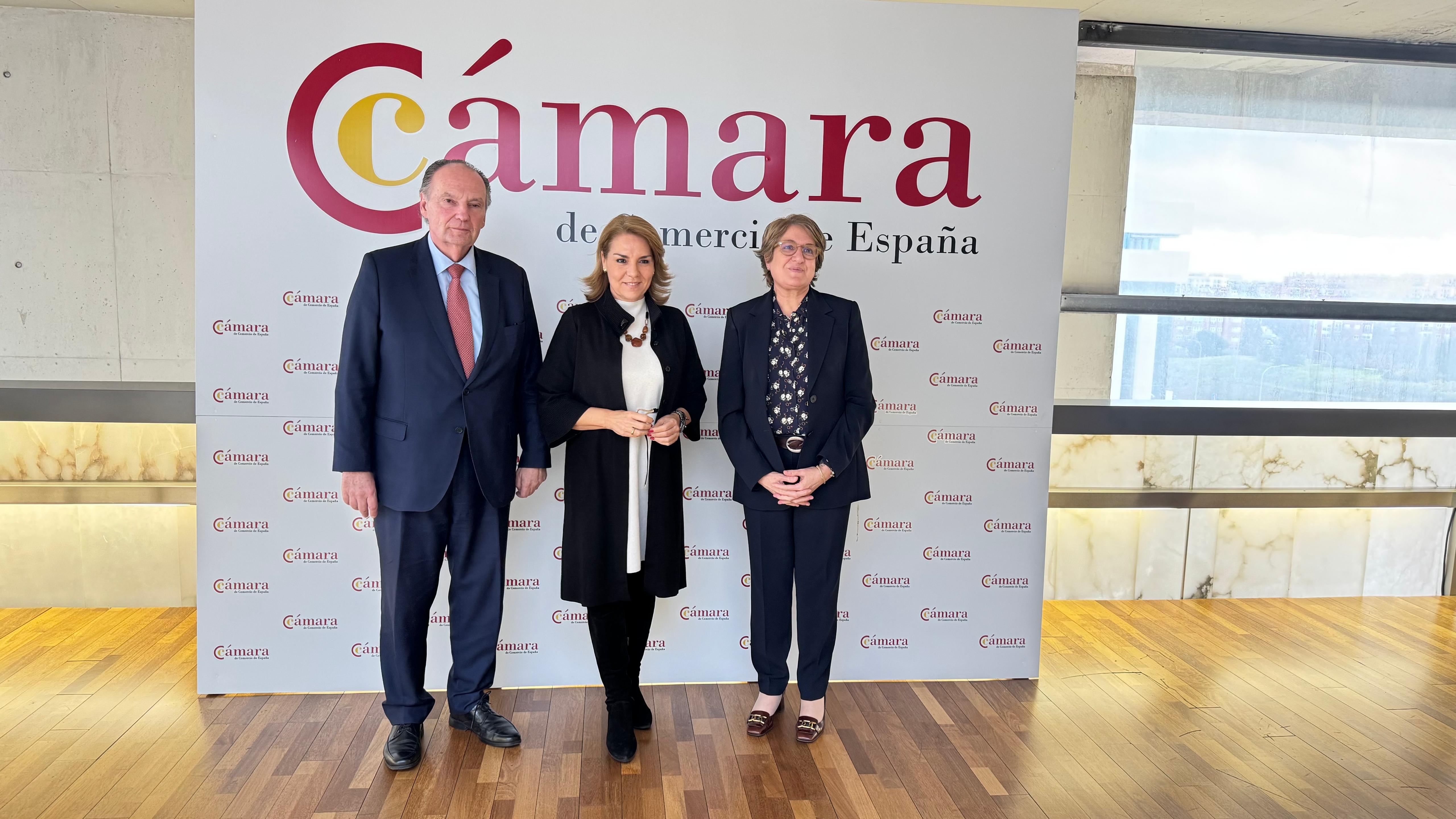 La directora general de Cámara de España, Inmaculada Riera (izd.) junto con la vicepresidenta primera de la Generalitat Valenciana, Susana Camarero; y el presidente de la Cámara de Valencia, José Vicente Morata