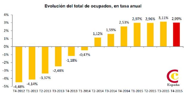 Madrid, 28/1/2016. La Encuesta de Población Activa (EPA) publicada hoy por el Instituto Nacional de Estadística confirma el año 2015 como clave para la creación de empleo. Con un crecimiento de los ocupados del 3% y un descenso histórico de los parados del 12,4% respecto al año anterior, España contaba a finales de 2015 con 18,1 millones de empleados y 4,8 millones de parados. Este último valor, aunque todavía muy elevado, no se había registrado desde el cuarto trimestre de 2010.