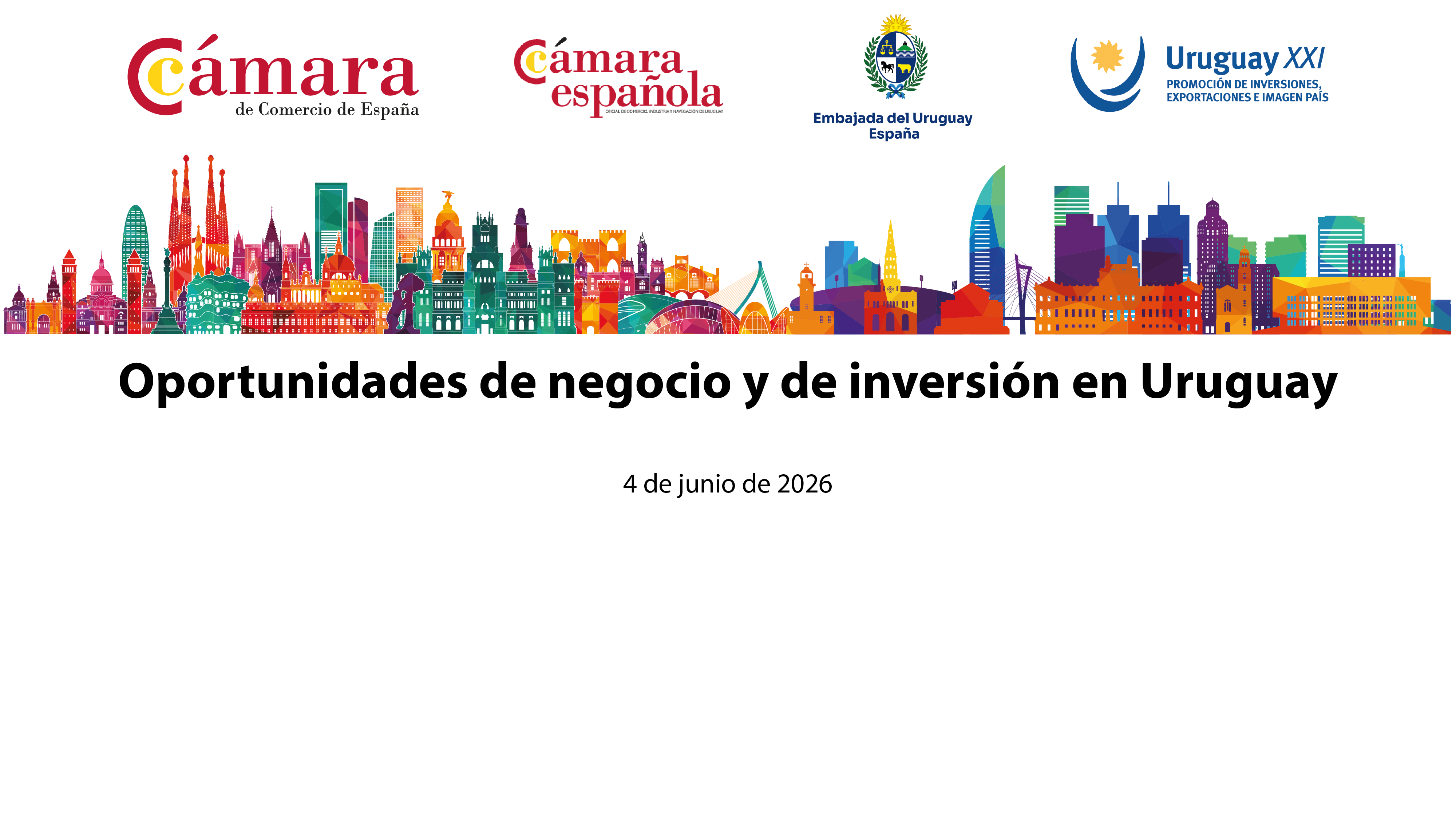 La Cámara de Comercio de España, en colaboración con Uruguay XXI y la Cámara Oficial Española de Comercio en Uruguay, tienen el placer de presentar “Oportunidades de negocio e inversión en Uruguay”, el próximo 04 de junio a las 09:30 h en la Cámara de Comercio de España (Ribera del Loira, 12 – 28042 Madrid).