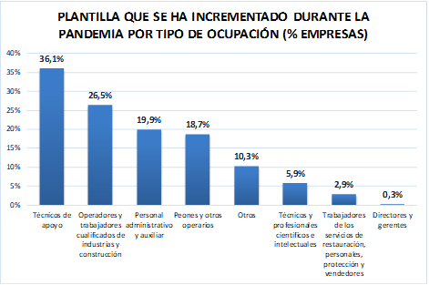 El estudio también refleja que el 49% de las empresas adoptó un Expediente de Regulación Temporal de Empleo (ERTE) en algún momento durante la pandemia. Se trata de una cifra algo más elevada que la proporcionada por el INE ya que el ámbito temporal de esta encuesta abarca todo el periodo de la pandemia. En el otro lado, entre las empresas que no utilizaron la herramienta del ERTE, un 25,5% incorporó personal durante ese periodo, siendo el perfil de “Técnico de apoyo” el contratado por el 36,1% de las compañías.