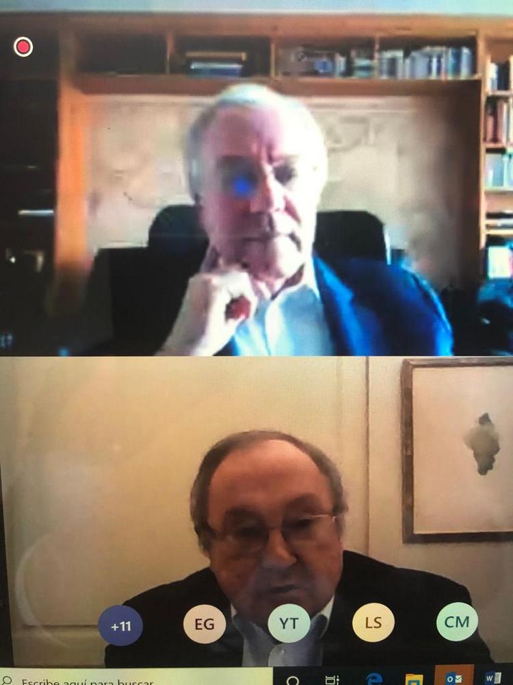 - El presidente de la Cámara de Comercio, José Luis Bonet,en videoconferencia con el presidente de Aico, Julián Domínguez. -
