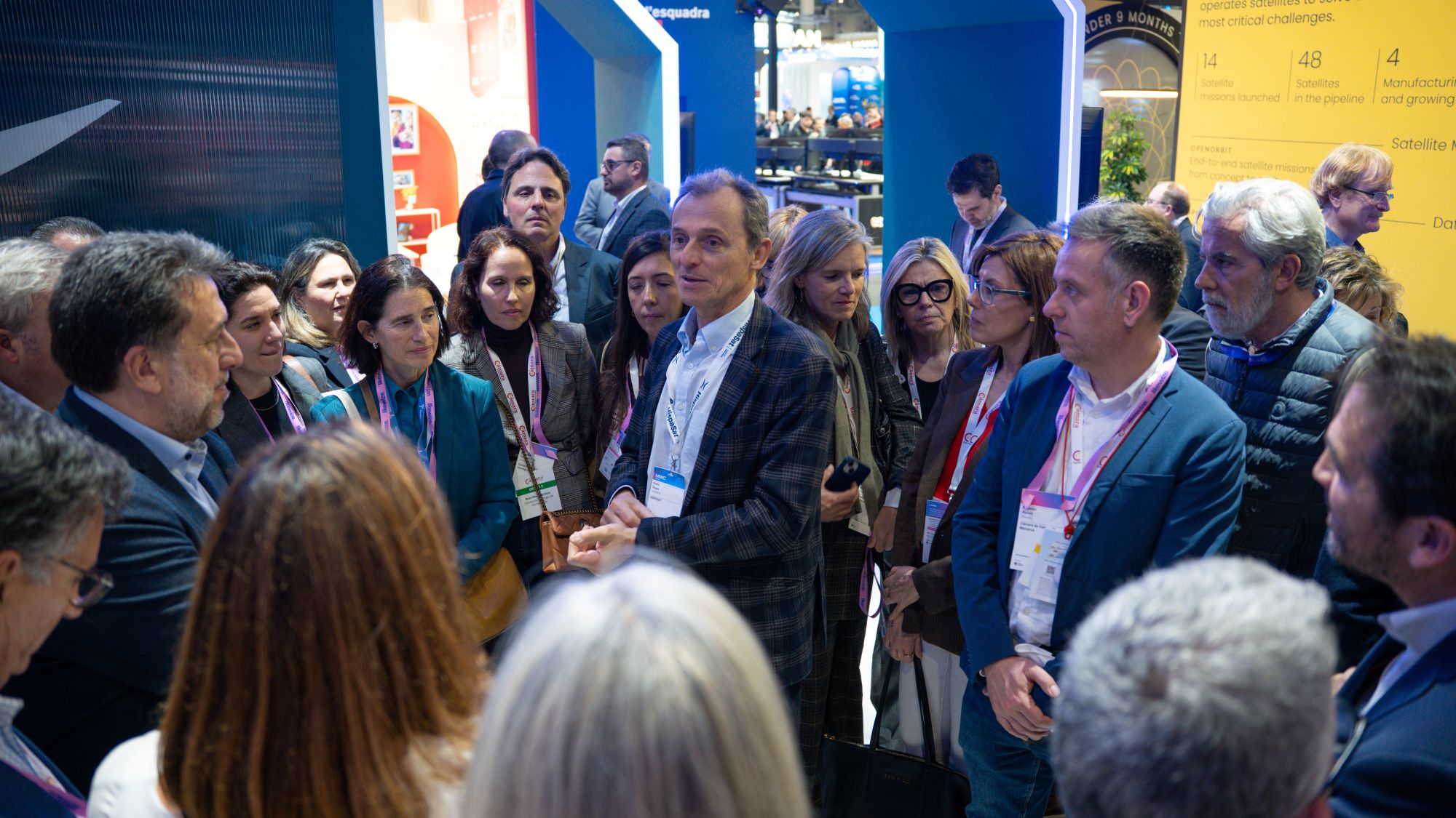 Pedro Duque, presidente de Hispasat, pudo conversar sobre los avances más punteros de la compañía con los directores generales de cámaras en el MWC26